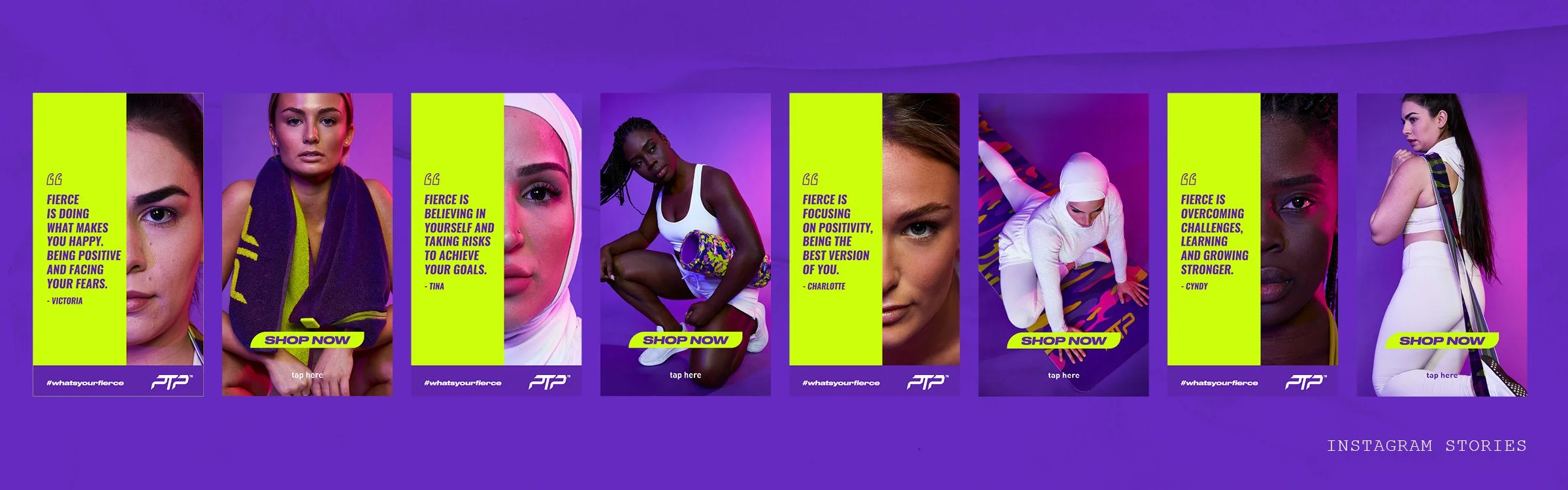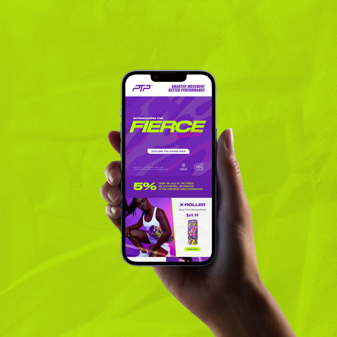 This campaign was a collaboration between PTP and The Confident Girls Foundation, a campaigned designed to empower women while donating 5% of all sales from the collection to the foundation. The collection featured PTP’s best-selling products, re-imagined with the Fierce Campaign identity. Working closely with the marketing and design team, we delivered a full suite of assets, including a campaign video, social content, web graphics, product packaging, and email marketing.